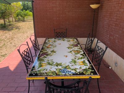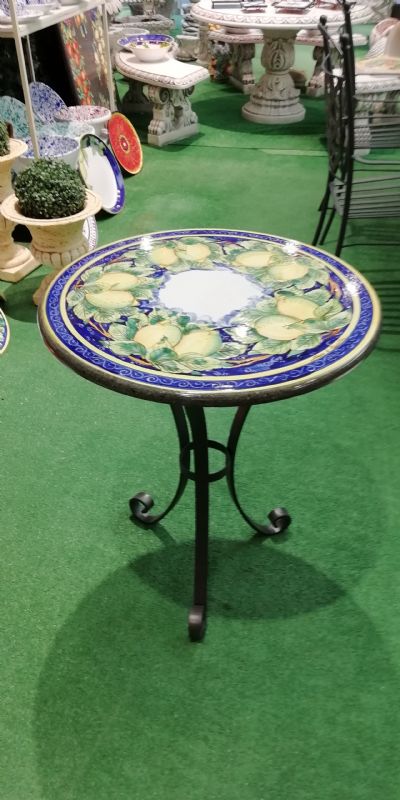 Tavolo costituito da pianale in Pietra Lavica dipinto a mano e ceramizzato in forno, e base in Ferrro Battuto verniciato in polvere e cotto in forno Disponibile nelle seguenti misure Formato Tondo Composto da 1 Lastra: cm 60 - cm